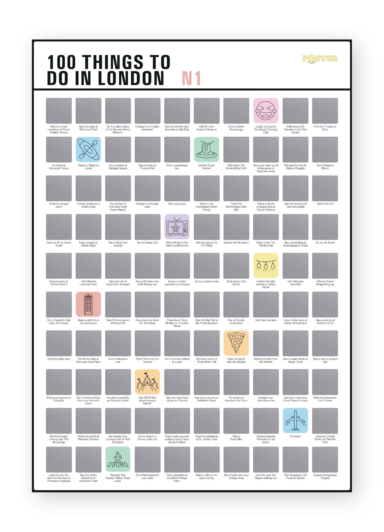 A scratch-off poster that includes 100 places, events, activities and challenges unique to London. Some seasonal, some year-round. Some free, some up to £35. You’ll have something to do for every mood, away from the tourist spots 🙌
